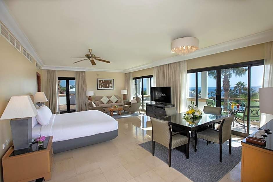 Offering stunning views of the Red Sea from three furnished balconies, this Mediterranean decorated room features a large living and dining area, a deluxe marble bath, king bedroom and work area offering free WiFi. It Includes access to a Club House offering secluded beach, gardens, a private swimming pool and whirl pool.